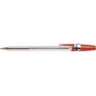 Kuličkové pero s víčkem, průhledným plastovým tělem, vroubkovanou rukojetí a vyměnitelnou náplní.