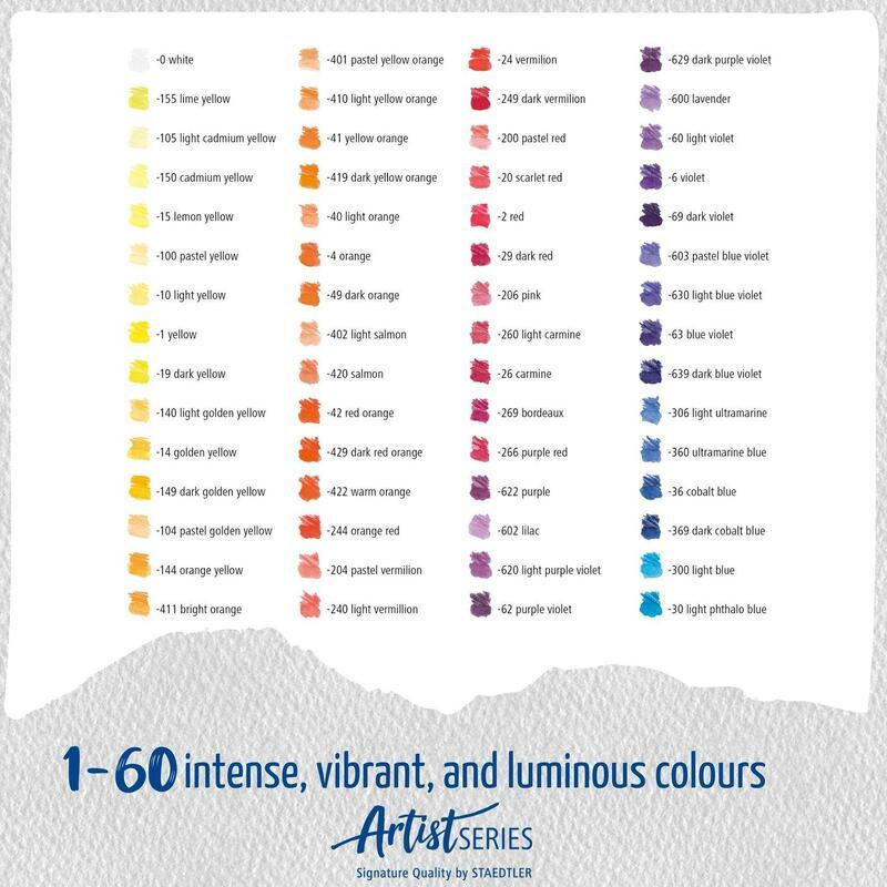 Vysoce kvalitní akvarelové pastelky pro nádherné suché i akvarelové kresby.Šestihranné pastelky s akvarelovou tuhouLze je používat i nasucho, avšak při použití vody a štětce umožňují na papíře vytvářet nádherné, zářivé efektyVysoký obsah pigmentu zajišťuje vynikající světlostálost a krycí schopnostiLze je použít pro řadu malířských technik a jejich kombinacíDisponují certifikací PEFC a splňují požadavky udržitelného lesního hospodářstvíPrůměr tuhy: cca 3,6 mmDoporučená ořezávátka - pro dosažení ideálního výsledku ořezání:TS51025BKC - Ořezávátko "Design Journey", 2 otvory, kovové, STAEDTLER (510 25BK-C)TS512002 - Ořezávátko, na 2 tužky, se zásobníkem na odpad, modré, STAEDTLER (512 002)V praktické kovové krabičceBarva: různáBalení: 120 ksKontaktní informace výrobce/prvního distributora v EU:STAEDTLER SEMoosäckerstr. 3, 90427 Nuremberg, Germanyinfo.de@staedtler.comhttps://www.staedtler.com/intl/en/service/contact/