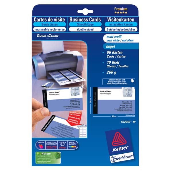 Avery Zweckform vizitky, s hladkým okrajem, 8ks/A4, oboustranné typ matné, bílé, A4, 260 g/m2, 85x54mm, 10 listů, pro inkoustové t