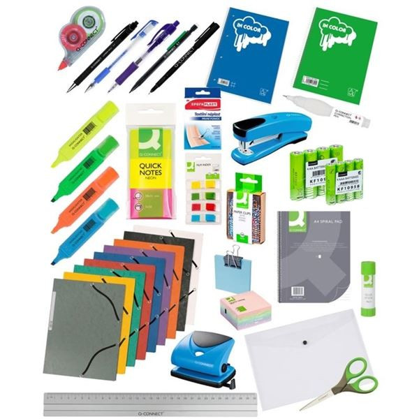 Popis - Balíček obsahuje: mikrotužku 0,7, kuličkové pero černé, liner černý, gelový roller modrý, kuličkové stiskací pero černé, samolepicí bločky v kostce 76 × 76 mm v intenzivních barvách, bločky 38×51 mm v neonových barvách, sešívačku a děrovačku na 20 listů, plastové samolepicí záložky, zvýrazňovač v barvě modré, žluté, zelené a oranžové, nůžky 17 cm, korekční roller, blok s boční vazbou velikosti A5 a A4, textilní náplasti, hliníkové pravítko, zakládací pouzdro s drukem, desky s chlopněmi, kovové klipy, kancelářské sponky a 2x alkalické baterie (AAA a AA) po 4 ks