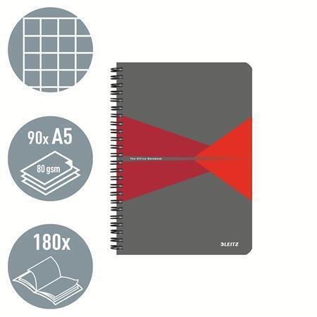 Blok "Office", šedo-červená, drátěná kroužková vazba, A5, čtverečkovaný, 90 listů, laminovaný povrch