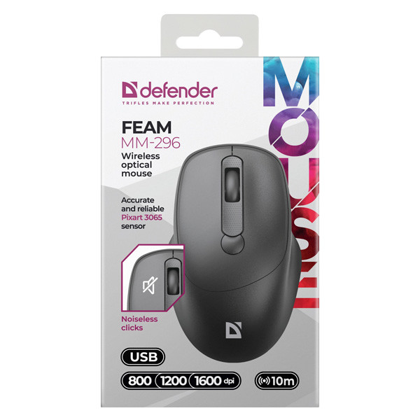 Defender FEAM MM-296 je bezdrátová optická kancelářská myš navržená s důrazem na váš komfort a produktivitu. Je navržena s ohledem na ergonomii, aby poskytovala optimální pohodlí při dlouhodobém používání. Její tvar a konstrukce byly pečlivě vyvinuty s cílem minimalizovat únavu ruky a zajistit příjemné držení.
