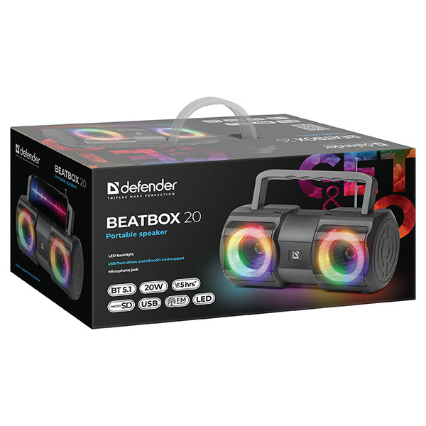 Defender reproduktor BEATBOX 20 Defender Beatbox 20 je kompaktní a přenosný bezdrátový reproduktor, který nabízí skvělý zvukový výkon v malém balení. Díky svému modernímu designu, robustní konstrukci a snadnému ovládání je ideálním společníkem pro poslech hudby na cestách, při sportu nebo při domácích oslavách.