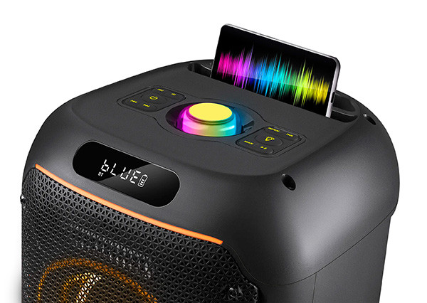 RGB podsvícení nabízí až 16,8 milionů barev a odstínů, které perfektně doladí náladu a vzhled reproduktoru. Praktické držadlo a gumové nožičky zajišťují snadnou přenosnost a stabilitu na různých površích. Vestavěný stojan na telefon umožní pohodlné sledování videí při poslechu hudby.