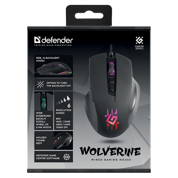 Tato myš Defender Wolverine nabízí až 14 režimů podsvícení a díky Software Defender Game center editor lze nastavit barvy podsvícení podle svých potřeb tak jako užitečné makra pro vaše hry. U myši lze nastavit až 6 režimů rozlišení a myš si udržuje stabilní výkon i při vyšších rychlostech. Určitě potěší speciálně tvarovaný úchop pro palce a pogumované  podsvícené kolečko. O dlouhou životnost se postará opletený kabel, který zaručí bezproblémový chod na dlouhé roky.
