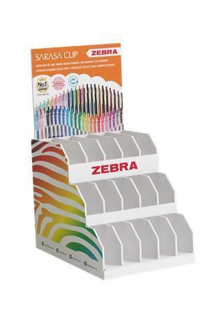 Praktický PVC displej s 15 přihrádkami a kapacitou pro 150 per. Horní část je otočná a lze ji také odstranit. Na jedné straně horní části je značka Zebra, na druhé straně gelová pera Sarasa, takže lze prezentovat více značek.