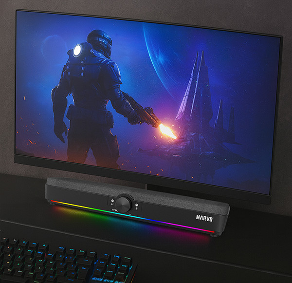 Soundbar Marvo nezná hranice, a tak je skvělým společníkem i pro poslech hudby a nebo sledování filmů. Pokud máte dost hraní a potřebujete vypnout, stačí se pouze usadit a užívat si relax. Už jste si dost odpočinuli? A co takhle filmyI 2.0 soundbar dokáže příjemně překvapit a nabízí kvalitnější zvuk než kdejaké televize. Navíc večerní atmosféru skvěle doplní RAINBOW podsvícení, které se nachází na spodní liště soundbaru - nabízí až 5 různých barev + 1 RGB efekt. Kabel dlouhý 1.5 metru nabízí dostatek prostoru a můžete si svůj soundbar položit kde chcete. Navíc vedle kolečka pro hlasitost naleznete na obou stranách vstupy pro sluchátka nebo mikrofon.