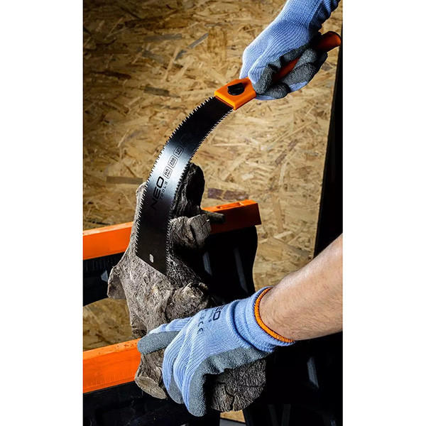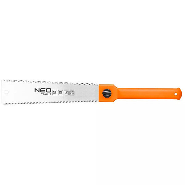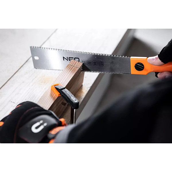 NEO Japonská jemně řezná pila, oboustranná (7 a 11 TPI) (ref. 44-612) má na obou stranách kotouče zuby pro oboustranné řezání. Na jedné straně jsou zuby pro podélné řezání (9 TPI) a na druhé straně napříč zrna (11 TPI). Čepel je vyrobena z manganové oceli a je dlouhá 250 mm. Třístranně broušené a indukčně kalené zuby výrazně snižují řezný odpor. Doporučuje se pro řezání suchého dřeva i překližky a dřevotřísky.