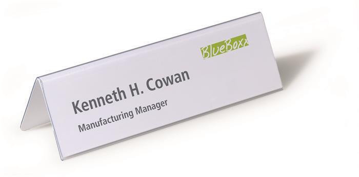 Jmenovka na stůl ve tvaru stříšky. S vyměnitelnými prázdnými vkládacími štítky pro oboustranné popisování