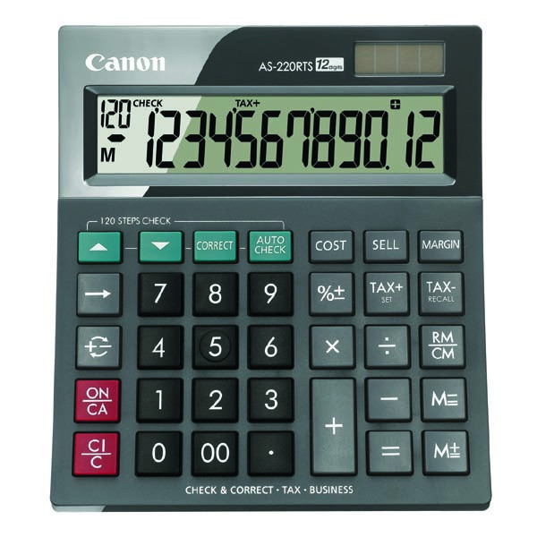 Zásluhou komplexních funkcí je 12ciferná kalkulačka AS-220RTS užitečná v libovolném obchodním nebo účetnickém prostředí. Tlačítko pro obchodní výpočty zvládne výpočty vlastních nákladů, prodejních cen a marží na jedno stisknutí. Funkce kontroly a korekce může uchovat v paměti až 120 výpočetních kroků a pomocí tlačítka automatické kontroly lze jednotlivé kroky postupně procházet. Umožňuje uživatelům zobrazit výpočty, provést změny a znovu je použít. Navíc jsou k dispozici všechna obvyklá tlačítka potřebná pro zajištění efektivity výpočtů, včetně tlačítek pro procenta, změnu znaménka a samostatných tlačítek 0 a 00.