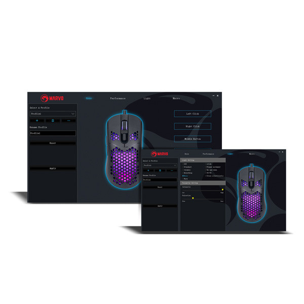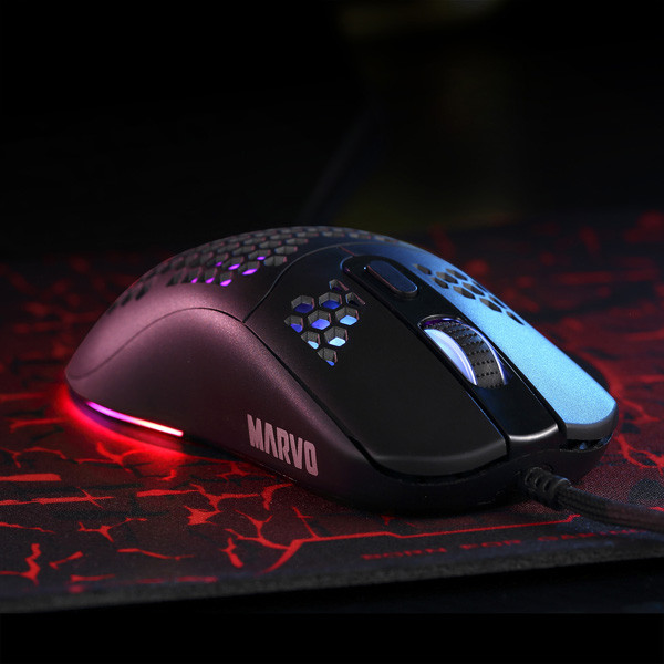 Optická herní myš Marvo G925 je ultralehká, díky speciálnímu perforovanému designu, který připomíná včelí plástve (Honeycomb design). Díky tomu váží pouhých 70 g a je proto snáz ovladatelná při hře. Při dlouhodobé práci a hrách, proto nebudete pociťovat únavu. Oku bude lahodit RGB podsvícení myši.