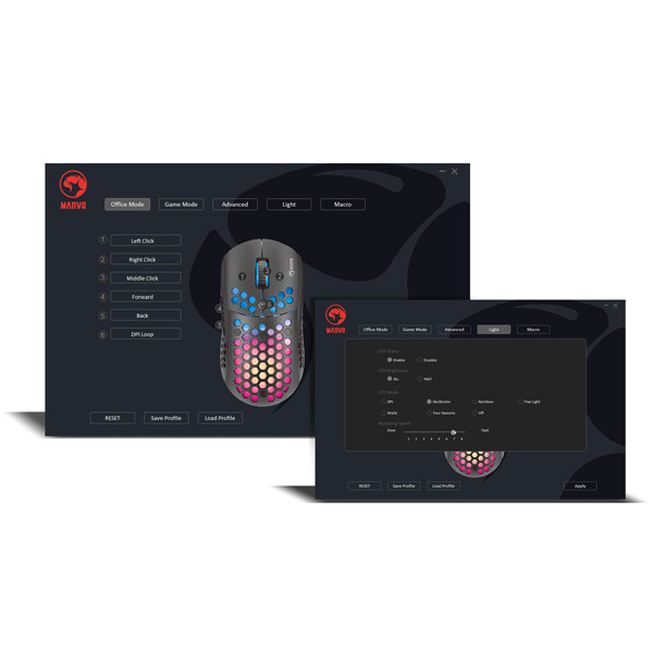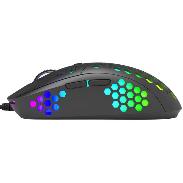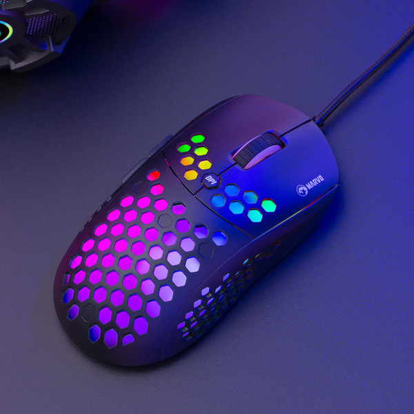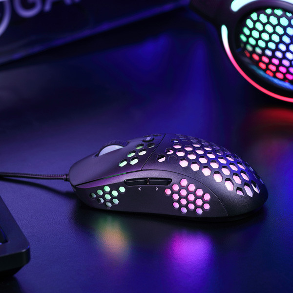 Herní myš M399 Velkou výhodou této herní myši je její hmotnost. Díky perforovaného designu připomínající včelí plástve (Honeycomb design), který dodává myši také jedinečnost, je váha pouhých 76 g. Proto s ní lze během hraní snadněji manipulovat. Při dlouhodobé práci a hrách nebudete pociťovat únavu. Ergonomický tvar zajišťuje podporu dlaně, což je její velkou výhodou. Oku bude lahodit RGB podsvícení.