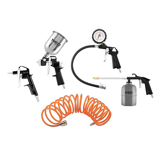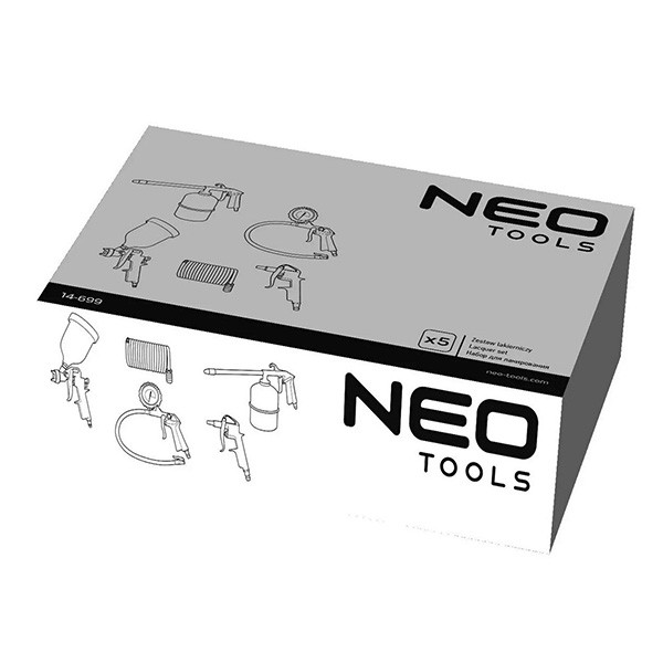 Obrazová sada, 14-699, NEO, se skládá z 5 kusů. Sada obsahuje: lakovací pistoli s horní nádrží, olejovou pistoli, proplachovací pistoli, pistoli na pumpování pneumatik s manometrem a spirálovou tlakovou hadici o délce 5 m. Sada poskytuje široké možnosti použití v dílně, například lakování, čerpání nebo čištění povrchů. Certifikát CE dokládá vysokou kvalitu nářadí. Značka NEO splňuje očekávání profesionálů.