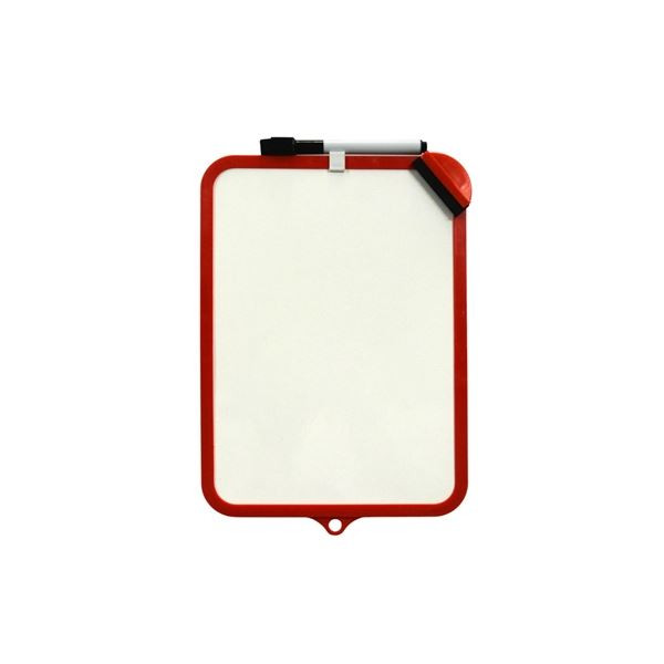 • Oboustranně stíratelná tabulka o rozměrech 19 x 29 cm s červeným rámečkem