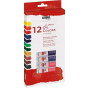Sada obsahuje 12 barevných odstínů po 12 ml (titanová bílá, kadmiová žluť, citronová, světlý nach, vermilonová červeň, karmínová červeň, pálená siena, pálená umbra, smaragdová zeleň, viridiánová zeleň, ultramarínová modř, kobaltová modř, černá).