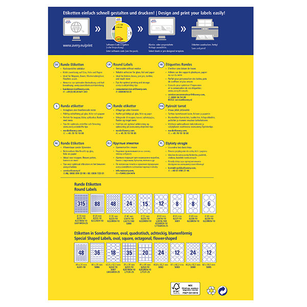 Dopřejte Vašim výrobkům originální označení a získejte pozornost vašich zákazníků prostřednictvím jasně viditelných a přitažlivých kulatých etiket. Kulaté etikety pomohou zdůraznit kvalitu jedinčných výrobků jako jsou například marmelády nebo vonné svíčky. Tyto etikety jsou navíc snímatelné - lze je jendoduše odlepit aniž by na podkladu zanechaly stopy po lepidle. Můžete si tak být jisti, že Váš produkt zůstane nepoškozen. Certifikace FSC a bělení bez použití chlóru - naše etikety Vás přesvědčí nejen tím, že jsou vyrobeny způsobem šetrným k životnímu prostředí, ale také prokázanou Top Kvalitou. Ostrý tisk, který se nerozmazává, vysoká lepivost na různých typech podkladů. Tyto vlastnosti našich etiket pravidelně testujeme ve vlastních laboratořích. Zároveň se můžete spolehnout na garanci plynulého tisku etiket a na to, že průchod archů etiket tiskárnou neznečistí tiskárnu lepidlem. Kulaté etikety mohou být potisknuty na všech běžných typech tiskáren. Pár jednoduchých kroků pro dokonale vypadající etikety: Další servis, který Vám bezplatně nabízíme - aplikace pro tvorbu profesionálně vypadajících etiket Online Designer Avery® Design & Print. Zde naleznete jak prázdné šablony, do kterých vložíte vlastní text či obrázek, tak i široký výběr již navržených, moderních designů etiket, které pravidelně aktualizujeme a vylepšujeme. Jednoduše zadejte kód etikety, zpracujte, vytiskněte a máte hotovo!