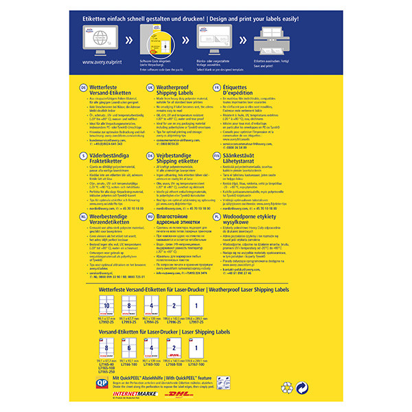 Posíláte poštu na dlouhé vzdálenosti? Chcete si být jisti, že v pořádku dorazí? Avery etikety odolné vůči vlivům počasí jsou silné a trvanlivé voděodolné etikety, které zůstanou nepoškozené, ať jsou počasí nebo podmínky jakékoliv. Rozmazané adresní etikety vypadají neprofesionálně a může být problematické je přečíst. Tyto etikety na zásilky jsou odolné vůči vodě, špíně, roztrhnutí, UV, teplotě, což zajišťuje jejich odolnost vůči vlivům počasí. Pokud použijete trvanlivou obálku, má význam používat tyto etikety, které tak doplní celé balení.