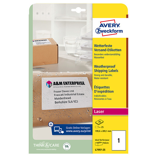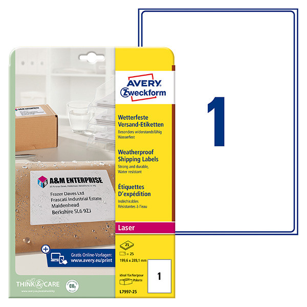 Avery Zweckform etikety 199.6mm x 289.1mm, A4, bílé, 1 etiketa, voděodolné, baleno po 25 ks, L7997-25, pro laserové tiskárny