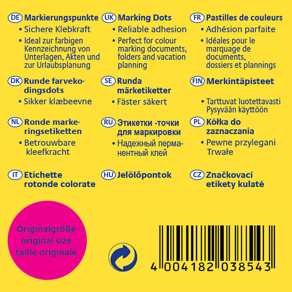 Samolepicí růžové značkovací kulaté etikety Avery Zweckform o průměru 19 mm přicházejí v praktickém zásobníku. Zásobník umožňuje snadnou manipulaci a zároveň slouží jako čistá a stabilní skladovací krabice. Značkovací kulaté etikety jsou ideální pro značení, archivaci, organizaci a plánování. 250 koleček na roli v zásobníku.