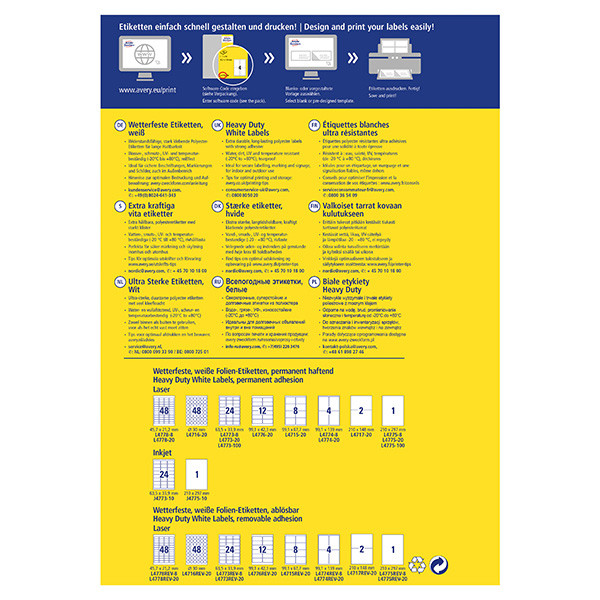 Skvělé řešení pro označování ve vlhkém a prašném prostředí - velmi odolné etikety od Avery Zweckform. Polyesterové etikety jsou mnohem odolnější než klasické papírové etikety. Skvěle se hodí pro trvalá a dlouhodobá značení v rušných prostrech průmyslových hal či skladů. Bez obav jimi můžete označit i venku stojící předměty. Mají vysokou lepivost, jsou odolné vůči mastnotě, znečištění, UV záření, vodě, natržení a výkyvům teplot od -20°C do +80°. Díky těmto vlastnostem si můžete být jisti, že Vaše označení vydrží na svém místě i za ztížených podmínek. Naše etikety Vás přesvědčí také prvotřídními tiskovými výsledky a prokázanou Top kvalitou. Ostrý tisk, který se nerozmazává a vysoká lepivost na nejrůznějších typech povrchů. Tyto vlastnosti našich etiket pravidelně testujeme ve vlastních laboratořích. Samozřejmě se můžete spolehnout na garanci plynulého tisku etiket a na to, že průchod archů etiket tiskárnou neznečistí tiskárnu lepidlem. Velmi odolné etikety mohou být potisknuty na všech běžných typech laserových tiskáren. Pár jednoduchých kroků pro dokonale vypadající etikety: Další servis, který Vám bezplatně nabízíme - aplikace pro tvorbu profesionálně vypadajících etiket Online Designer Avery® Design & Print. Zde naleznete jak prázdné šablony, do kterých vložíte vlastní text či obrázek, tak i široký výběr již navržených, moderních designů etiket, které pravidelně aktualizujeme a vylepšujeme. Jednoduše zadejte kód etikety, zpracujte, vytiskněte a máte hotovo!