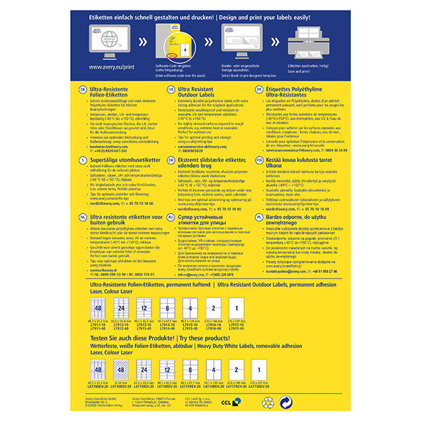 Etikety do těch nejnáročnějších podmínek - ultra odolné etikety od Avery Zweckform. Jejich vlastnosti oceníte jak v interiéru, tak ve venkovním prostředí. Silná přilnavost etiket k různým povrchům, odolnost vůči mořské vodě, mastnotě, špíně, UV záření a teplotám mezi -40°C a + 150°C. Díky těmto vlastnostem se skvěle hodí zejména pro značení ve výrobě, skladech, ke značení kontejnerů apod. Navíc jsou tyto omyvatelné etikety odolné vůči mnohým rozpouštědlům a čisticím prostředkům. Ultra odolné etikety Vás přesvědčí také prvotřídními tiskovými výsledky a prokázanou Top kvalitou. Ostrý tisk, který se nerozmazává a vysoká lepivost na nejrůznějších typech povrchů. Tyto vlastnosti našich etiket pravidelně testujeme ve vlastních laboratořích. Samozřejmě se můžete spolehnout na garanci plynulého tisku etiket a na to, že průchod archů etiket tiskárnou neznečistí tiskárnu lepidlem. Ultra odolné etikety mohou být potisknuty na všech běžných typech laserových tiskáren. Další servis, který Vám bezplatně nabízíme - aplikace pro tvorbu profesionálně vypadajících etiket Avery® Design & Print. Zde naleznete jak prázdné šablony, do kterých vložíte vlastní text či obrázek, tak i široký výběr již navržených, moderních designů etiket, které pravidelně aktualizujeme a vylepšujeme. Pár jednoduchých kroků pro dokonale vypadající etikety: jednoduše zadejte kód etikety, zpracujte, vytiskněte a máte hotovo!