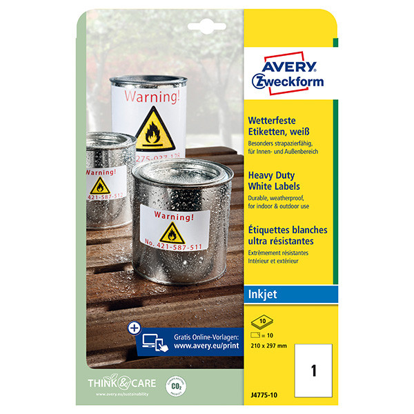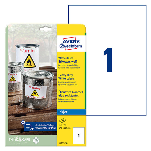 Avery Zweckform etikety 210mm x 297mm, A4, matné, bílé, 1 etiketa, velmi odolné, baleno po 10 ks, J4775-10, pro inkoustové tiskárn