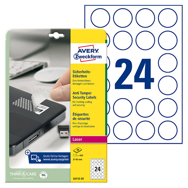 Avery Zweckform etikety 40mm, A4, matné, bílé, 480 etiket, s ochranou proti manipulaci, baleno po 20 ks, L6112-20, pro laserové ti