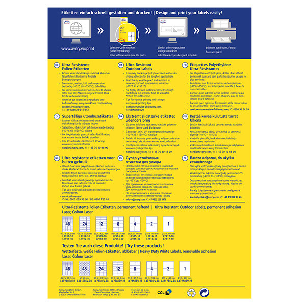 Etikety do těch nejnáročnějších podmínek - ultra odolné etikety od Avery Zweckform. Jejich vlastnosti oceníte jak v interiéru, tak ve venkovním prostředí. Silná přilnavost etiket k různým povrchům, odolnost vůči mořské vodě, mastnotě, špíně, UV záření a teplotám mezi -40°C a + 150°C. Díky těmto vlastnostem se skvěle hodí zejména pro značení ve výrobě, skladech, ke značení kontejnerů apod. Navíc jsou tyto omyvatelné etikety odolné vůči mnohým rozpouštědlům a čisticím prostředkům. Ultra odolné etikety Vás přesvědčí také prvotřídními tiskovými výsledky a prokázanou Top kvalitou. Ostrý tisk, který se nerozmazává a vysoká lepivost na nejrůznějších typech povrchů. Tyto vlastnosti našich etiket pravidelně testujeme ve vlastních laboratořích. Samozřejmě se můžete spolehnout na garanci plynulého tisku etiket a na to, že průchod archů etiket tiskárnou neznečistí tiskárnu lepidlem. Ultra odolné etikety mohou být potisknuty na všech běžných typech laserových tiskáren. Další servis, který Vám bezplatně nabízíme - aplikace pro tvorbu profesionálně vypadajících etiket Avery® Design & Print. Zde naleznete jak prázdné šablony, do kterých vložíte vlastní text či obrázek, tak i široký výběr již navržených, moderních designů etiket, které pravidelně aktualizujeme a vylepšujeme. Pár jednoduchých kroků pro dokonale vypadající etikety: jednoduše zadejte kód etikety, zpracujte, vytiskněte a máte hotovo!