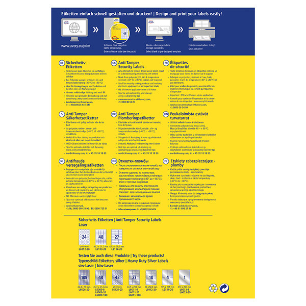 Tyto etikety s ochranou proti manipulaci ocenítě především při označování hodnotných předmětů, kancelářského nábytku nebo elektroniky. Pokud se etikety někdo snaží odstranit ,zanechají po sobě viditelný šachovnicový vzor. Není možné je znovu nalepit, takže jakákoliv manipulace je ihned zřejmá. Etikety jsou navíc odolné vůči mastnotě, špíně, kapkám vody, natržení. Pro potisknutí etiket snadným a rychlým způsobem využijte náš bezplatný software pro návrh a tisk etiket Avery Design & Print nebo si zdarma stáhněte šablony v Microsoft® Office.