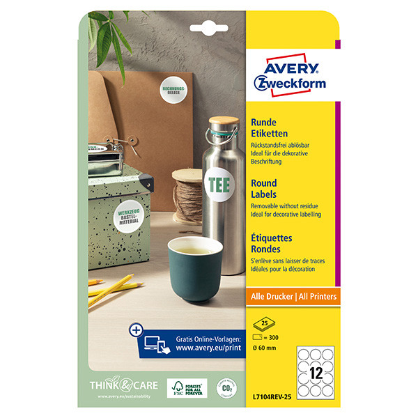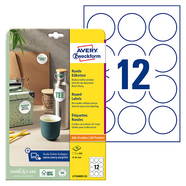 Avery Zweckform etikety 60mm, A4, bílé, 12 etiket, snímatelné, baleno po 25 ks, L7104REV-25, pro laserové a inkoustové tiskárny, k