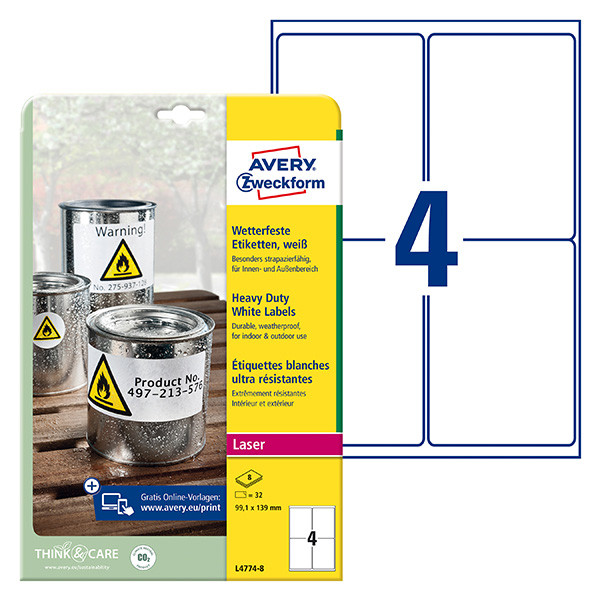 Avery Zweckform etikety 99.1mm x 139mm, A4, matné, bílé, 4 etikety, velmi odolné, baleno po 8 ks, L4774-8, pro laserové tiskárny a