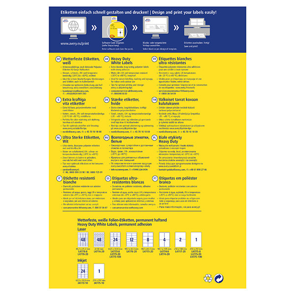 Skvělé řešení pro označování ve vlhkém a prašném prostředí - velmi odolné etikety od Avery Zweckform. Polyesterové etikety jsou mnohem odolnější než klasické papírové etikety. Skvěle se hodí pro trvalá a dlouhodobá značení v rušných prostorech průmyslových hal či skladů. Bez obav jimi můžete označit i venku stojící předměty. Mají vysokou lepivost, jsou odolné vůči mastnotě, znečištění, UV záření, vodě, natržení a výkyvům teplot od -20°C do +80°C. Díky těmto vlastnostem si můžete být jisti, že Vaše označení vydrží na svém místě i za ztížených podmínek. Naše etikety Vás přesvědčí také prvotřídními tiskovými výsledky a prokázanou Top kvalitou. Ostrý tisk, který se nerozmazává, a vysoká lepivost na nejrůznějších typech povrchů. Tyto vlastnosti našich etiket pravidelně testujeme ve vlastních laboratořích. Samozřejmě se můžete spolehnout na garanci plynulého tisku etiket a na to, že průchod archů etiket tiskárnou neznečistí tiskárnu lepidlem. Velmi odolné etikety mohou být potisknuty na všech běžných typech laserových tiskáren. Další servis, který Vám bezplatně nabízíme - aplikace pro tvorbu profesionálně vypadajících etiket Avery® Design & Print. Zde naleznete jak prázdné šablony, do kterých vložíte vlastní text či obrázek, tak i široký výběr již navržených, moderních designů etiket, které pravidelně aktualizujeme a vylepšujeme. Pár jednoduchých kroků pro dokonale vypadající etikety: jednoduše zadejte kód etikety, zpracujte, vytiskněte a máte hotovo!