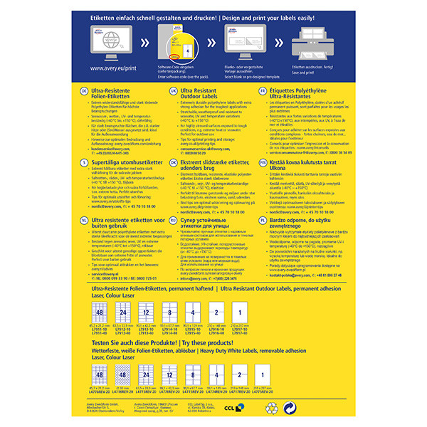 Etikety do těch nejnáročnějších podmínek - ultra odolné etikety od Avery Zweckform. Jejich vlastnosti oceníte jak v interiéru, tak ve venkovním prostředí. Silná přilnavost etiket k různým povrchům, odolnost vůči mořské vodě, mastnotě, špíně, UV záření a teplotám mezi -40°C a + 150°C. Díky těmto vlastnostem se skvěle hodí zejména pro značení ve výrobě, skladech, ke značení kontejnerů apod. Navíc jsou tyto omyvatelné etikety odolné vůči mnohým rozpouštědlům a čisticím prostředkům. Ultra odolné etikety Vás přesvědčí také prvotřídními tiskovými výsledky a prokázanou Top kvalitou. Ostrý tisk, který se nerozmazává a vysoká lepivost na nejrůznějších typech povrchů. Tyto vlastnosti našich etiket pravidelně testujeme ve vlastních laboratořích. Samozřejmě se můžete spolehnout na garanci plynulého tisku etiket a na to, že průchod archů etiket tiskárnou neznečistí tiskárnu lepidlem. Ultra odolné etikety mohou být potisknuty na všech běžných typech laserových tiskáren. Pár jednoduchých kroků pro dokonale vypadající etikety: Další servis, který Vám bezplatně nabízíme - aplikace pro tvorbu profesionálně vypadajících etiket Online Designer Avery® Design & Print. Zde naleznete jak prázdné šablony, do kterých vložíte vlastní text či obrázek, tak i široký výběr již navržených, moderních designů etiket, které pravidelně aktualizujeme a vylepšujeme. Jednoduše zadejte kód etikety, zpracujte, vytiskněte a máte hotovo!