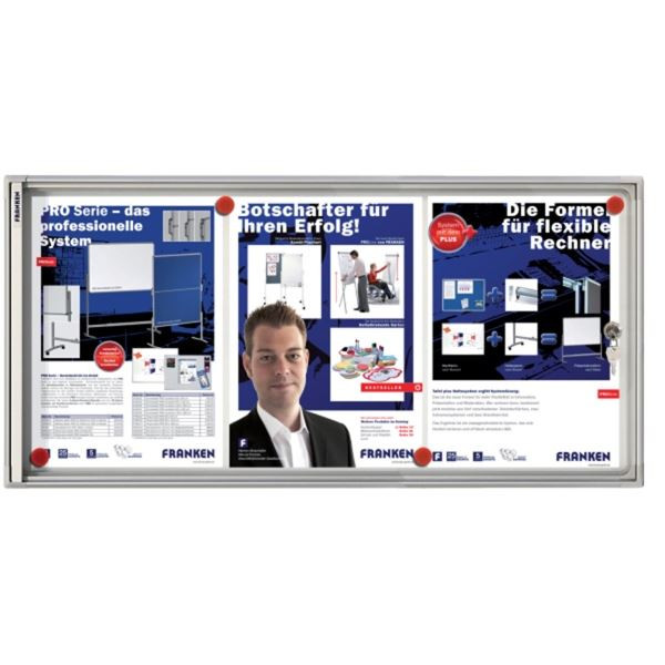 Popis - Plochá, nízkoprofilová, nástěnná, aretovatelná vitrína s bílým magnetickým povrchem a rámem z anodizovaného hliníku (1,9 cm) s možností nastavení na výšku nebo na šířku
