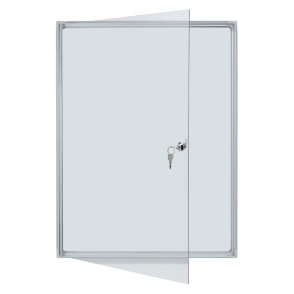 Popis - Plochá, nízkoprofilová, nástěnná, aretovatelná vitrína s bílým magnetickým povrchem a rámem z anodizovaného hliníku (1,9 cm) s možností nastavení na výšku nebo na šířku