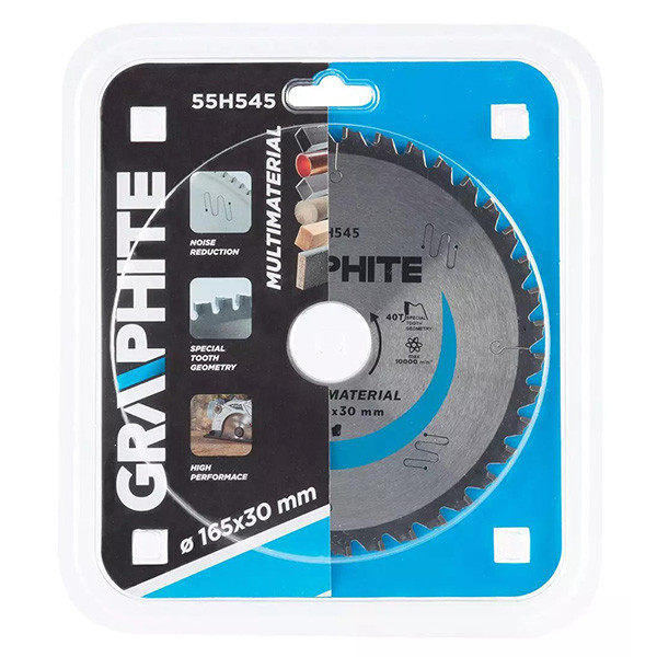 Pilové kotouče s HM hroty GRAPHITE (ref. 55H545), vnější průměr 165 mm a vnitřní 30 mm, má 40 zubů, umožňuje vyšší řeznou rychlost. Pilové kotouče založené na speciální konstrukci zubů a použití speciálního tvrdokovu. Univerzální pilové kotouče, které není třeba vyměňovat při výměně řezaného materiálu. Zuby FWF díky speciálnímu designu a široké části hřebenu zaručují pevnost. Určeno pro řezání různých druhů materiálů, např. ocelové a hliníkové profily a další neželezné kovy, jako je měď, plasty, dřevo s drobnými hřebíky, OSB desky, překližky, větve, lamináty atd. Použití kompenzačních řezů snižuje hladinu hluku a mezery zvyšují stabilitu ostří a přesnost řezu. Kotoučové pilové kotouče zajišťují čistý řez.