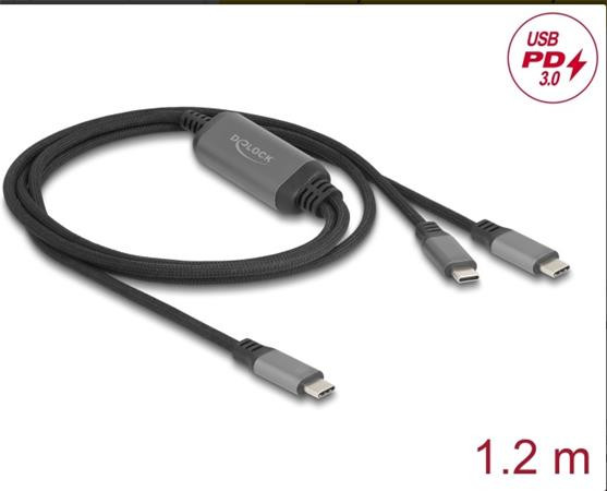Delock Kabel USB-C™ ve tvaru Y, z 1 x zástrčky na 2 x zástrčky PD 3.0, 100 W inteligentní rozvod proudu, 1,2 m
