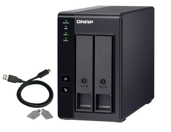 QNAP 2-bay 3.5" SATA HDD USB 3.1 Gen2 10Gbps type-C hardware RAID external enclosure. USB-C to USB-A cable included. Expansion uni