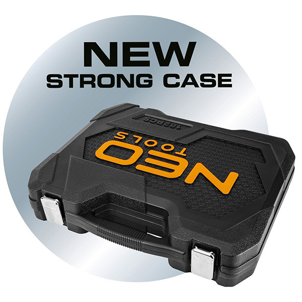 NEO 1/2" a 1/4" (č. v. 10-066) obsahuje 110 kusů z vysoce kvalitní chrom-vanadiové oceli. Sada obsahuje ráčny 1/2" a 1/4". Sada obsahuje širokou škálu nástrčných hlavic (velikosti 4 až 32 mm) a bitů (ploché, křížové, šestihranné, Torx). Sada je navíc vybavena širokou škálou příslušenství. Vše je dodáváno v praktickém kufříku. Spolehlivost výrobku je potvrzena zárukou 25 let. Značka NEO splňuje očekávání profesionálů.