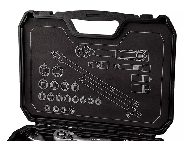 Veškeré nářadí je přehledně uspořádáno v robustním plastovém kufru, který zaručuje bezpečné uložení, snadnou organizaci a pohodlné přenášení. Díky přesným výřezům má každý nástroj své místo, což usnadňuje orientaci a zrychluje práci.