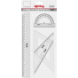 Obsah sady: 1x 30 cm pravítko, 1x 20 cm trojúhelník s úhlem 45°, 1x 23 cm trojúhelník s úhlem 60°, 1x 10 cm úhloměr 180°