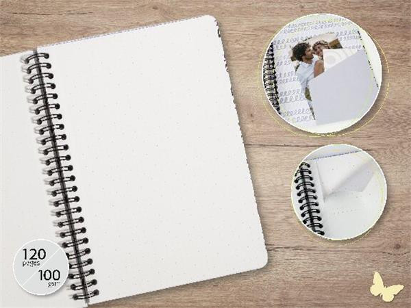 Spirálový sešit s mikro perforovanými listy a kapsou na zadní straně. Sešit má tvrdé, matné desky.