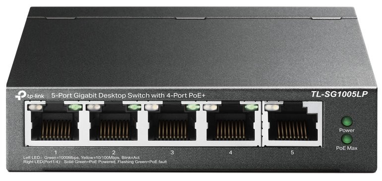 TP-Link PoE Switch TL-SG1005LP je nemanagovatelný Gigabitový PoE Switch s 5x 10/100/1000Mbps z čehož 4 porty podporují PoE-Out se standardem 802.3af/at (až 30W/port). Celkový PoE budget switche je 40W. Bonusem tohoto PoE switche je inteligentní Power Management pro případné odpojení PoE zařízení v případě nedostatečného PoE budgetu.