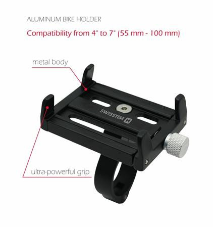 Kovový držák smartphonu 4-7", který se dá využít jak na kolo, elektrokolo, skůtr atd. Baleno v blistru SWISSTEN.