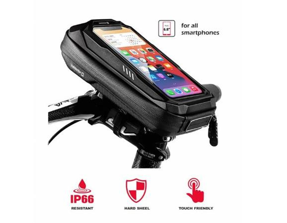 Voděodolné pouzdro na kolo pro Váš smartphone. Je vybaveno vývodem pro sluchátka a průhlednou slídou. Baleno v blistru SWISSTEN.