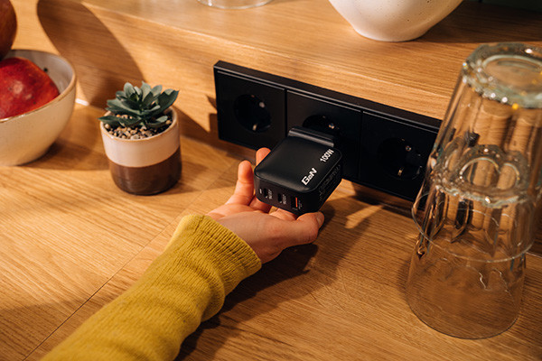 • 100W miniaturní nástěnná nabíječka se 3 výstupními porty: 2 x USB-C® PD 100W a 1 x USB-A QC 3.0