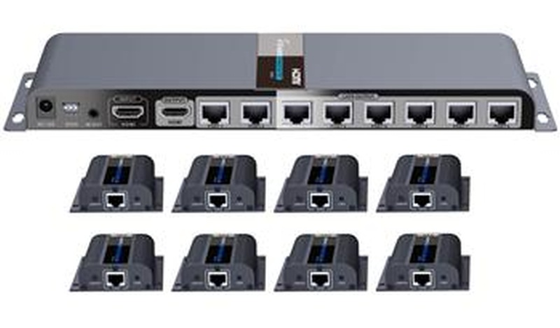 Extender se skládá z jedné vysílací jednotky s lokálním výstupem HDMI a osmi přijímači, které se propojí CAT6/6a/7 kabelem s vysílačem.